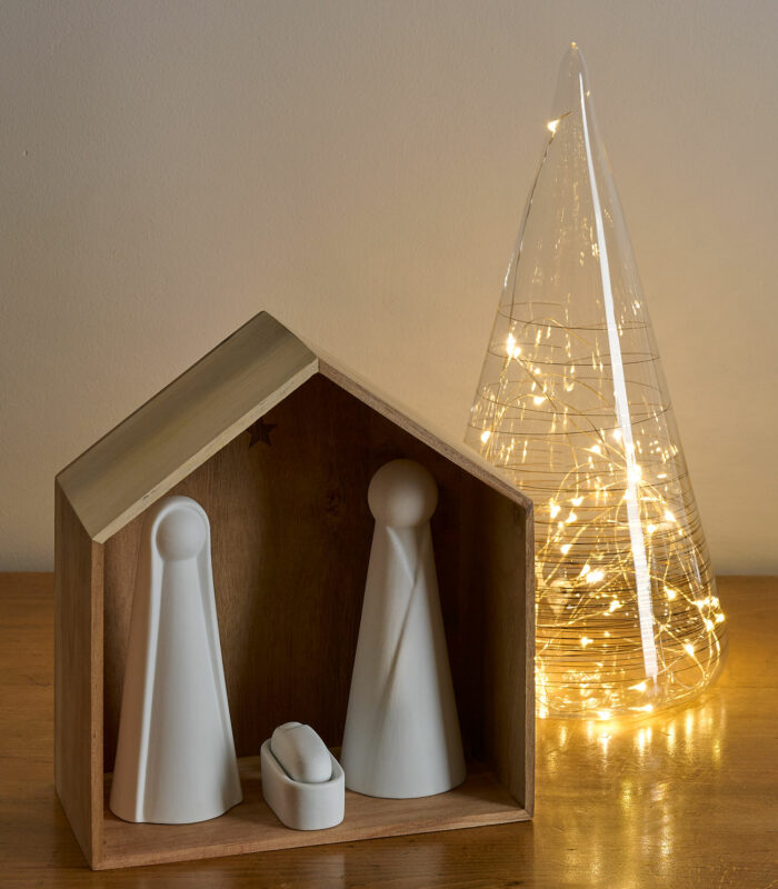 Crèche en bois d’acacia avec les trois figurines de la nativité en porcelaine blanche.