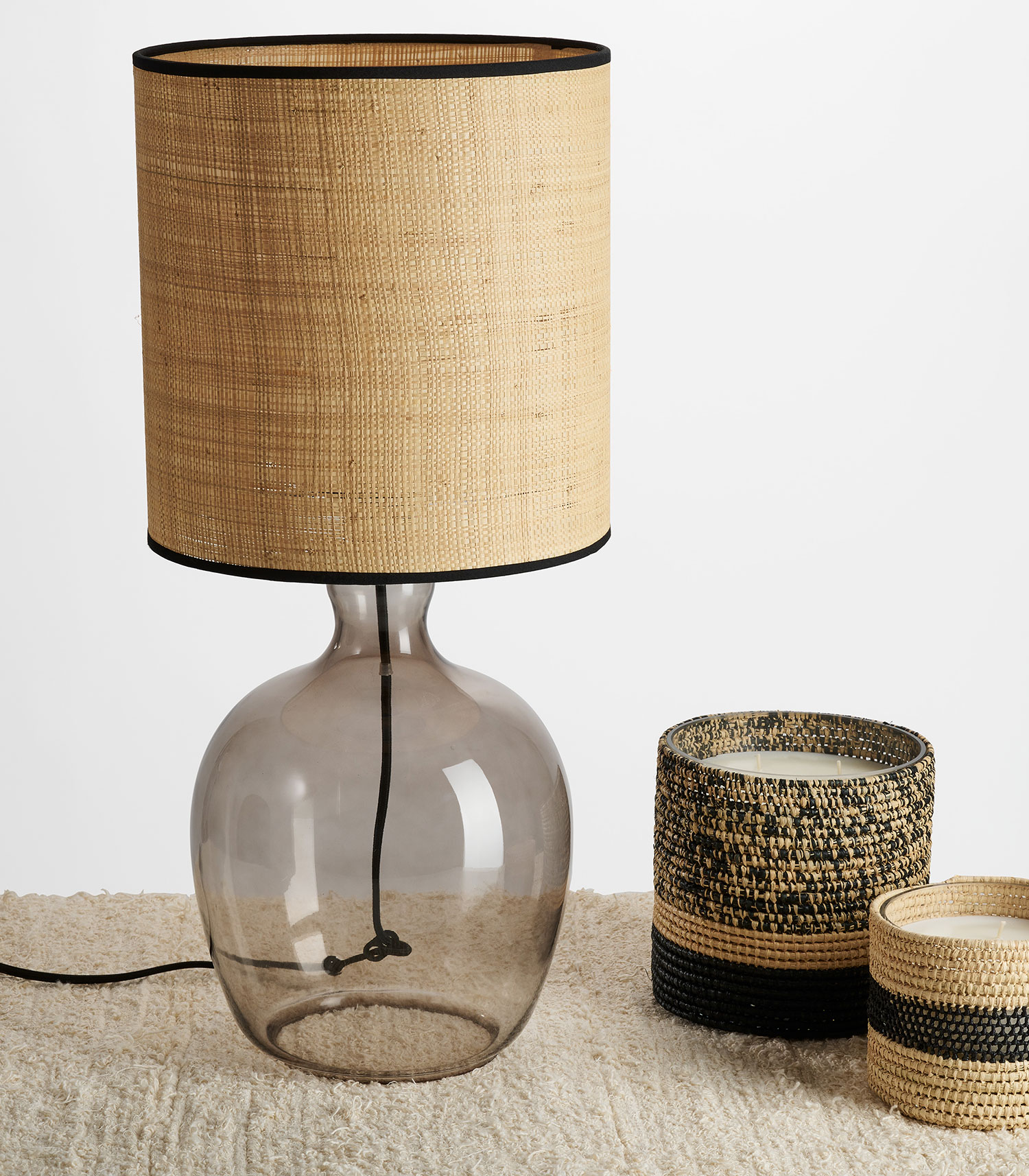 Lampe en verre transparent ou fumé dotée d’un abat-jour en raphia naturel aux bordures noires. Elle diffuse une lumière douce et cosy pour une ambiance et un intérieur apaisants.